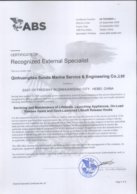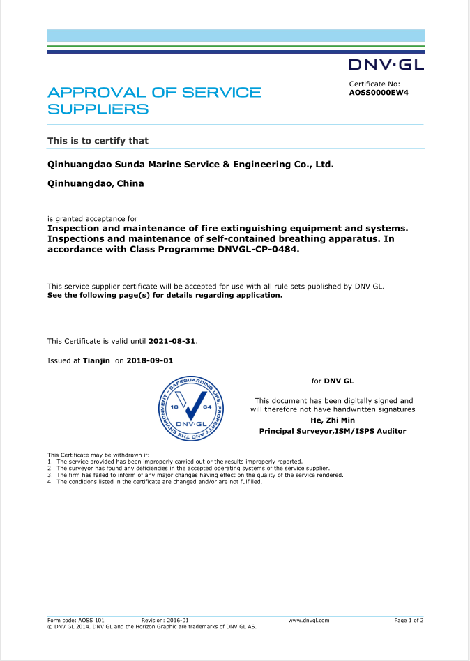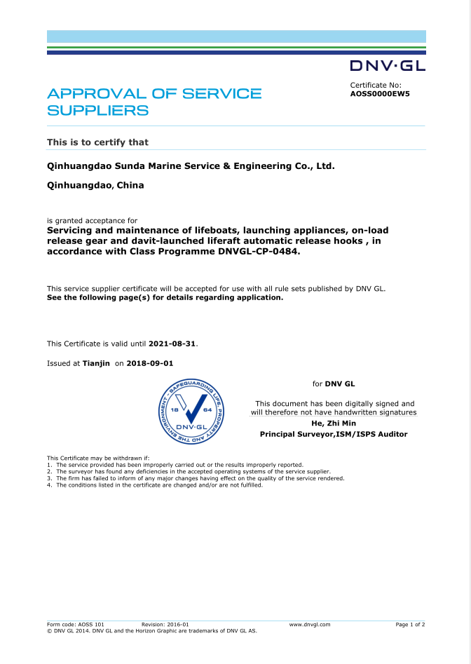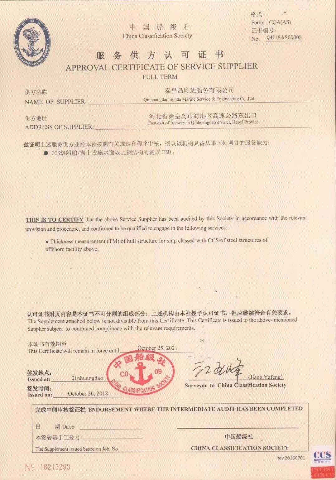秦皇島順達(dá)船務(wù)有限公司位于美麗的海濱城市、中國(guó)北方著名的能源輸出大港--秦皇島。公司從事于船舶修理、物料供應(yīng)、水下檢測(cè)、船體測(cè)厚、消防救生設(shè)備及救生艇檢驗(yàn)、電氣自動(dòng)化修理等服務(wù)。 公司自1997年成立至今,先后為國(guó)內(nèi)外船東修理、檢驗(yàn)各類船舶萬余艘,積累了豐富的施工經(jīng)驗(yàn)。公司現(xiàn)有場(chǎng)地100余畝,員工30余人,以及工程用車若干臺(tái)。我們公司一直本著嚴(yán)以律己、真誠(chéng)待人、精益求精、信譽(yù)至上的經(jīng)營(yíng)理念,以優(yōu)質(zhì)的服務(wù)、專業(yè)的施工、合理的收費(fèi),得到了國(guó)內(nèi)外船東的廣泛認(rèn)可,贏得了良好的口碑和信譽(yù)。 公司已取得了中國(guó)船級(jí)社(CCS)、美國(guó)船級(jí)社(ABS)、日本船級(jí)社(NK)、德國(guó)船級(jí)社(DNV GL)等各個(gè)船級(jí)社的消防救生和救生艇檢驗(yàn)資質(zhì), ...